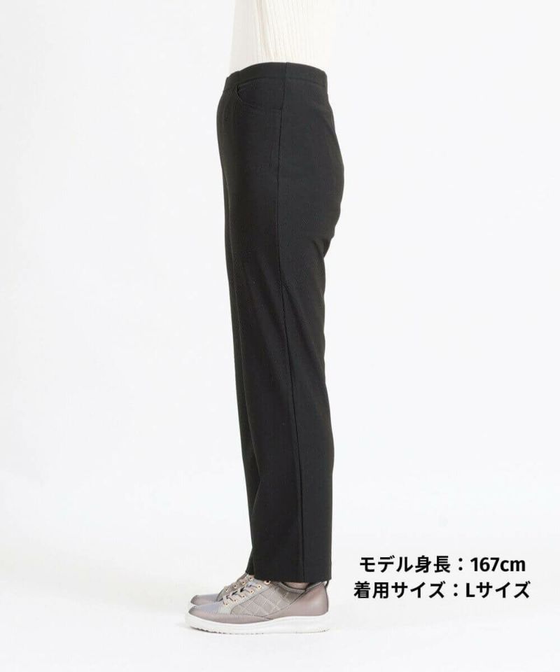 ウエストは総ゴム仕様。独自のパターン設計で、見た目はスッキリしながらも締め付け感は少なく、長時間はいていても窮屈さを感じにくくなっています。