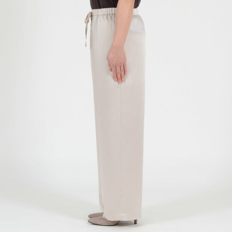 サテン生地のパンツには、きれいな光沢・しなやかなドレープ・さらさらして体にまとわりつかない穿き心地のよさなど、魅力がたっぷり。