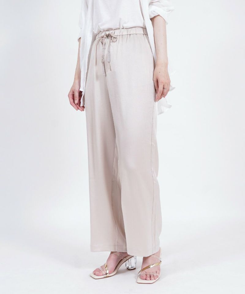 いつものスタイリングにこのサテンパンツを投入するだけで、大人のこなれ感を演出できます。