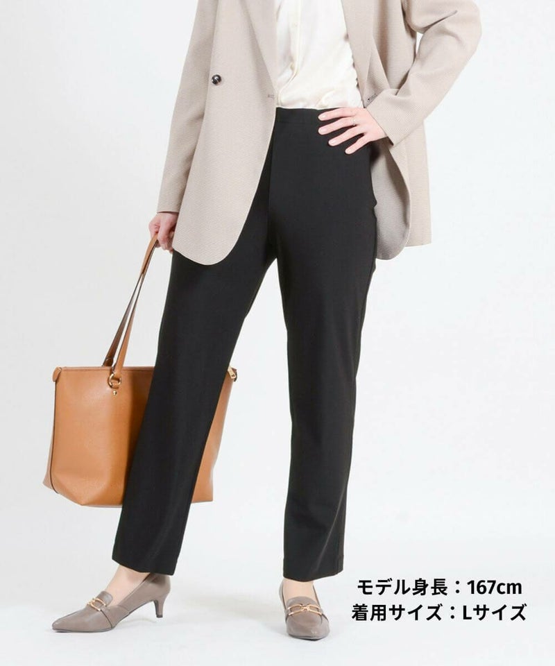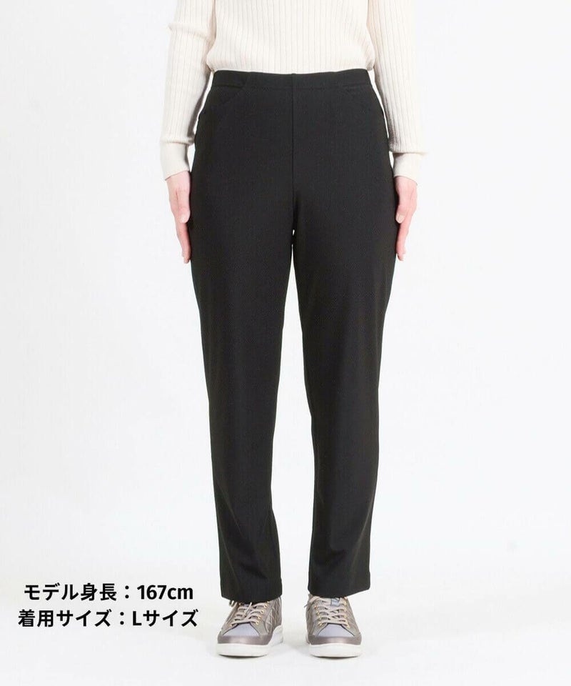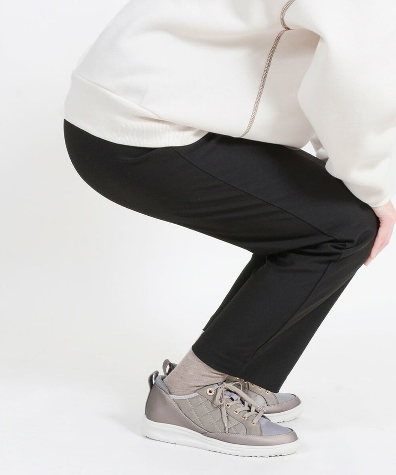 ウエストは総ゴム仕様。独自のパターン設計で、見た目はスッキリしながらも締め付け感は少なく、長時間はいていても窮屈さを感じにくくなっています。