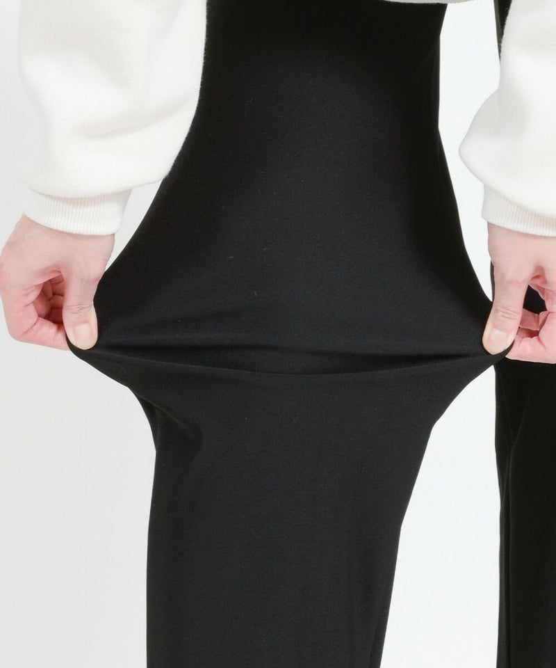 ハリ感のある生地が立体的なフォルムを作り、脚のラインを拾いにくいため、すっきりとした美脚シルエットを演出。