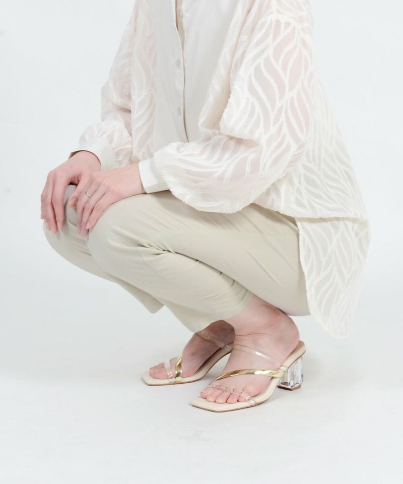 適度なハリとツヤ感は、品よくきれいな印象に。 通常内側と外側に入れる切替えを真横ではなく、前身側に寄せたことで視覚的に脚がすっきり細見えします。