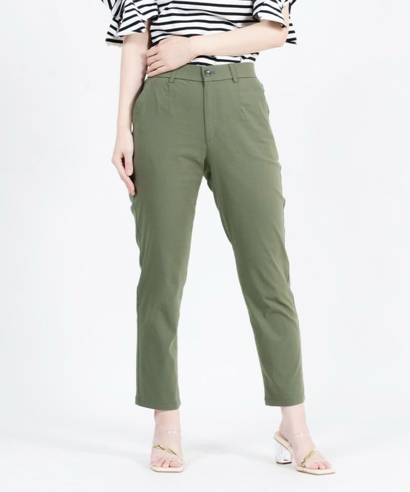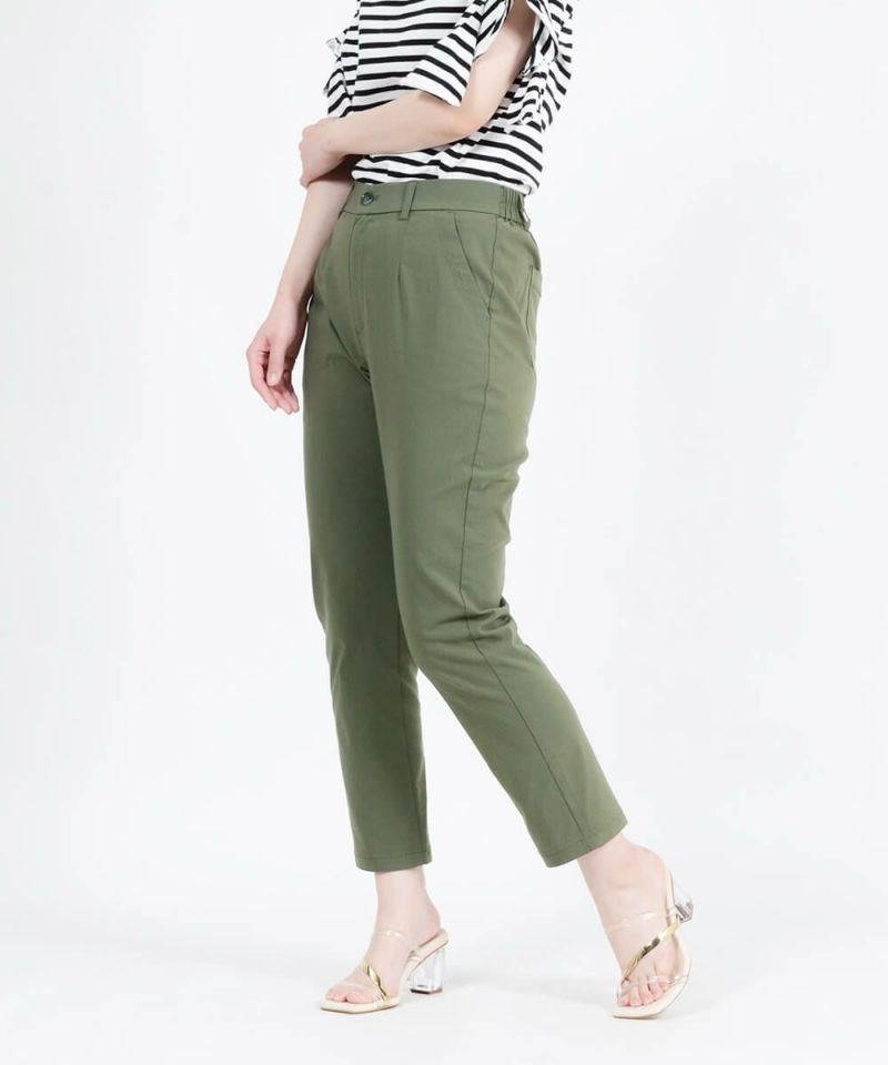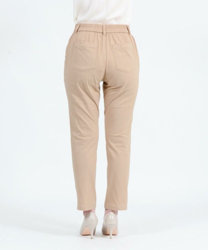 年齢を重ねると気になるウエストやヒップ周りをきれいに魅せるパターン設計で、はき心地と美脚を両立させました。 ウエストは前開きかつ、タックインをしたときもすっきりと見えるベルト仕様。