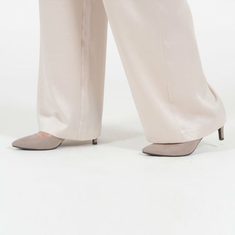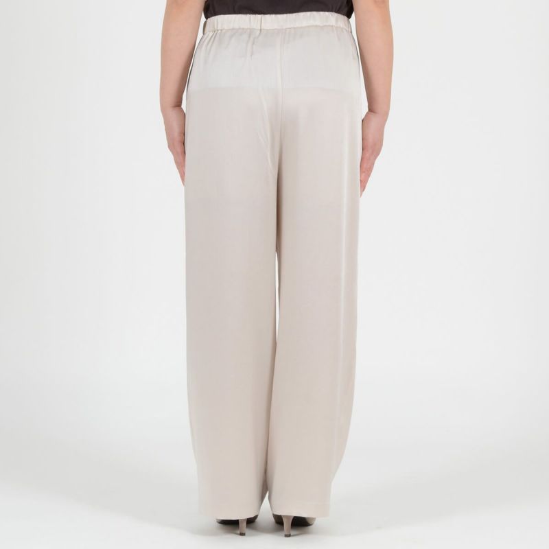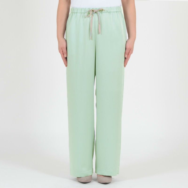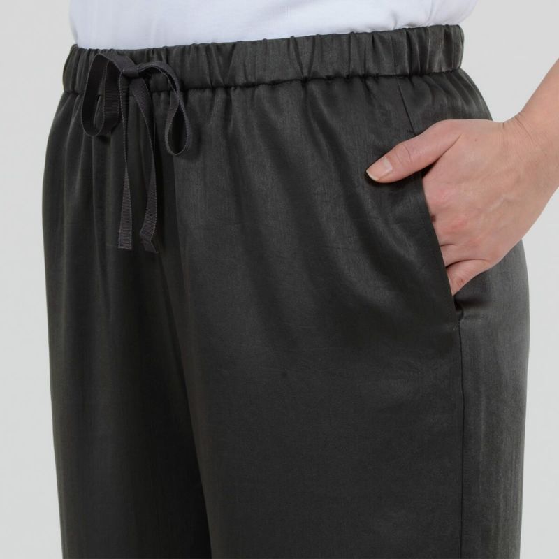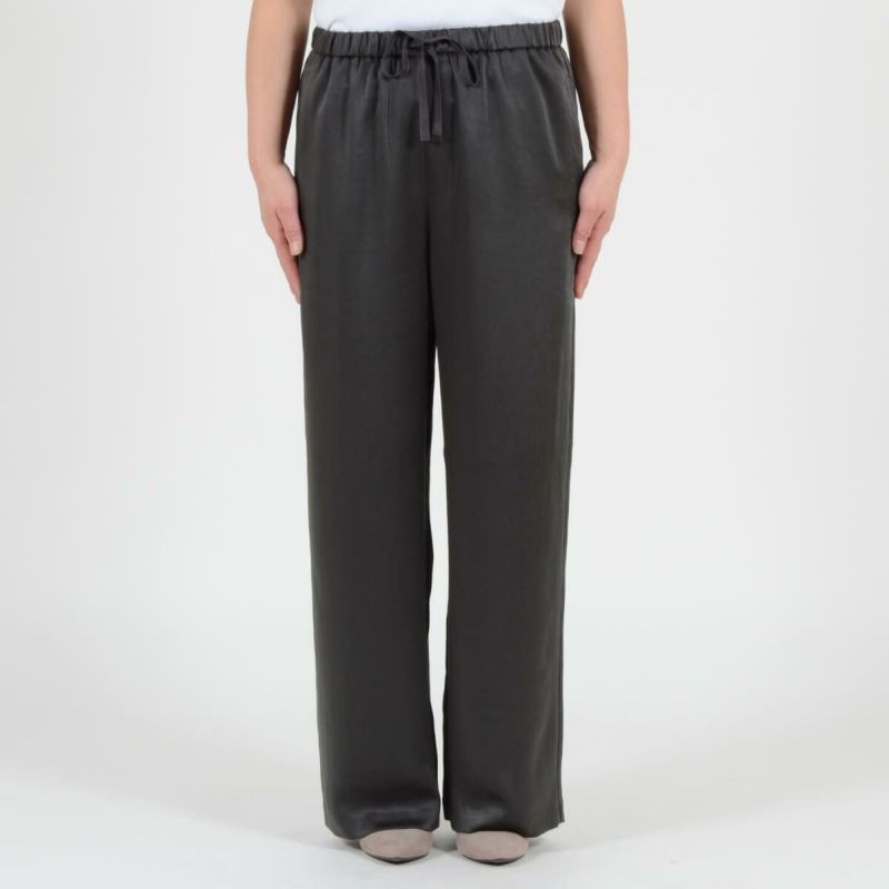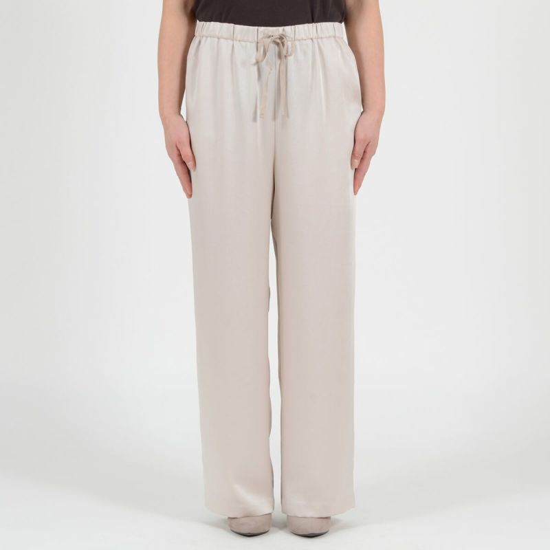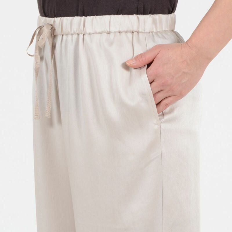 サテン生地のパンツには、きれいな光沢・しなやかなドレープ・さらさらして体にまとわりつかない穿き心地のよさなど、魅力がたっぷり。