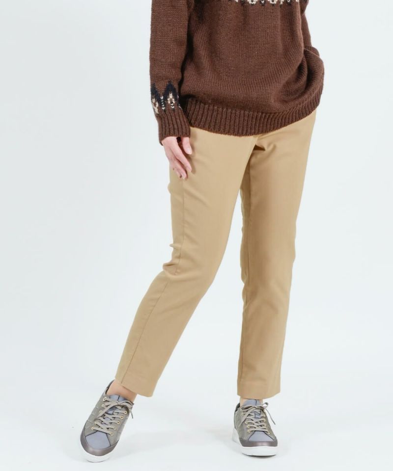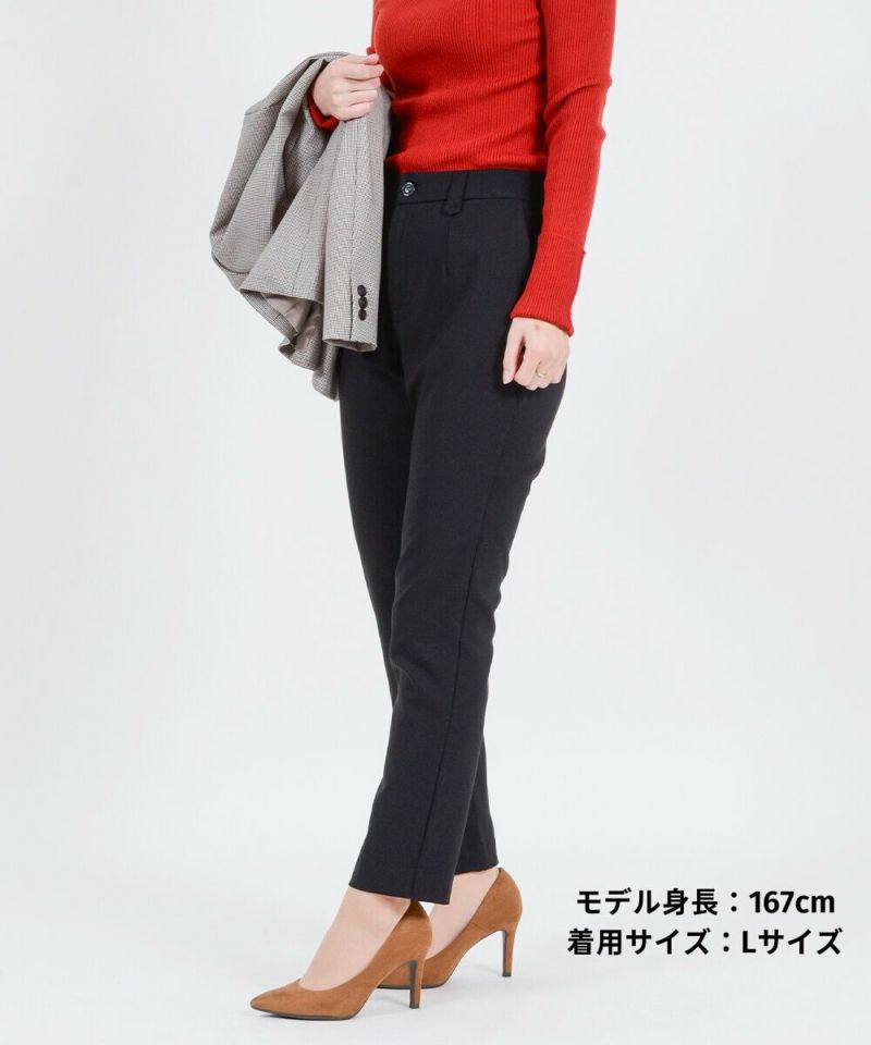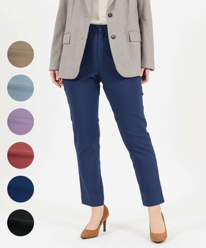 年齢を重ねると気になるウエストやヒップ周りをきれいに魅せるパターン設計で、はき心地と美脚を両立しました。 デザインを極力シンプルに仕上げることで、シルエットの美しさが際立ち優美で気品のある印象に! 足首に向けて細くなるラインでしっかり細見えします。