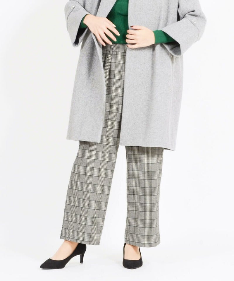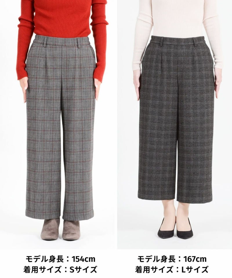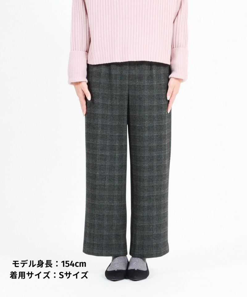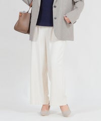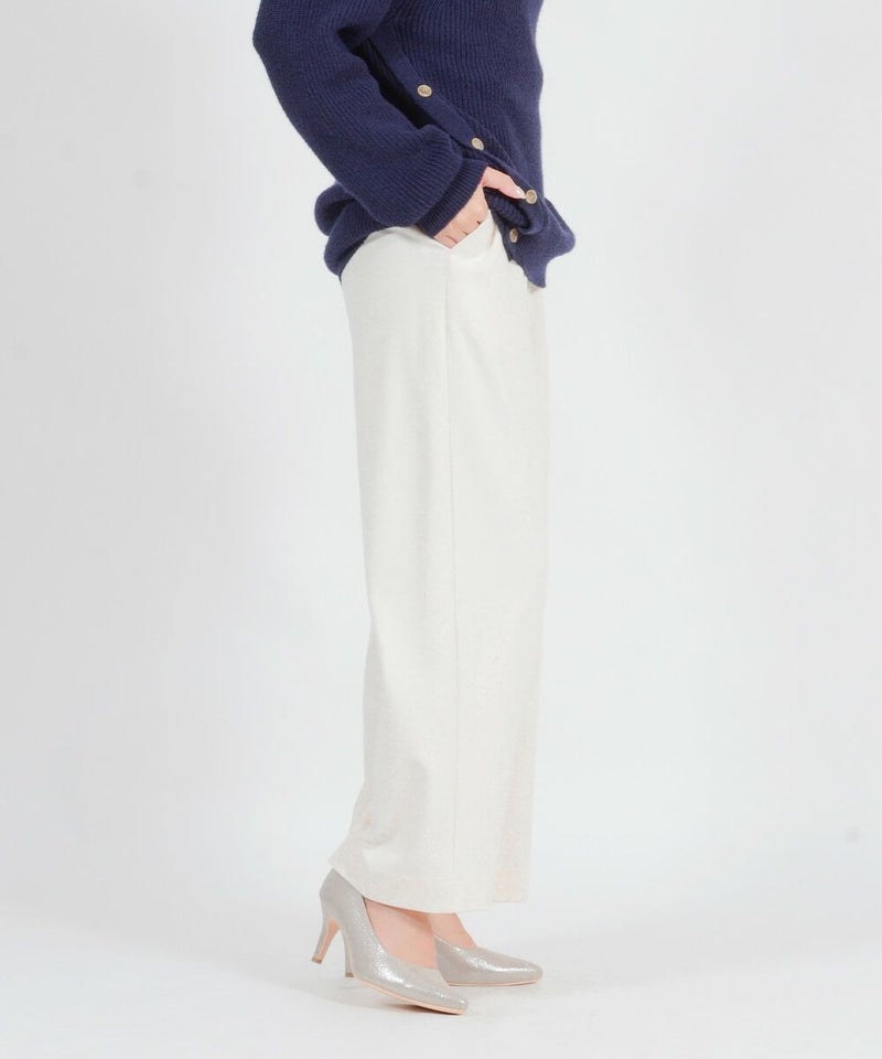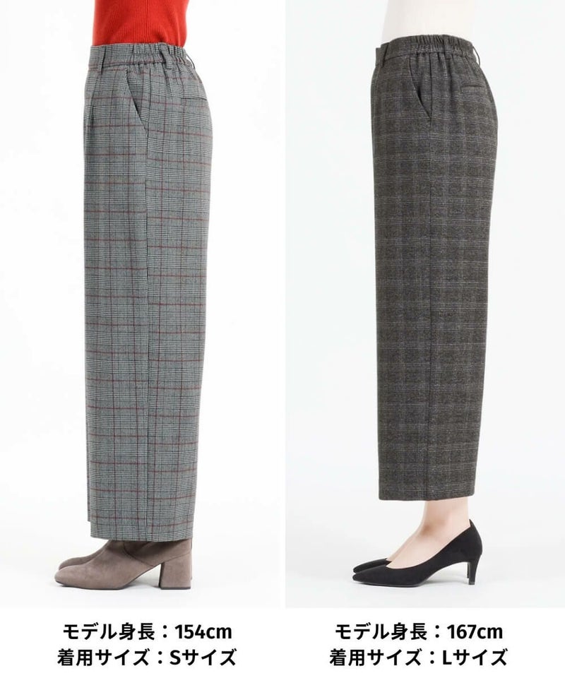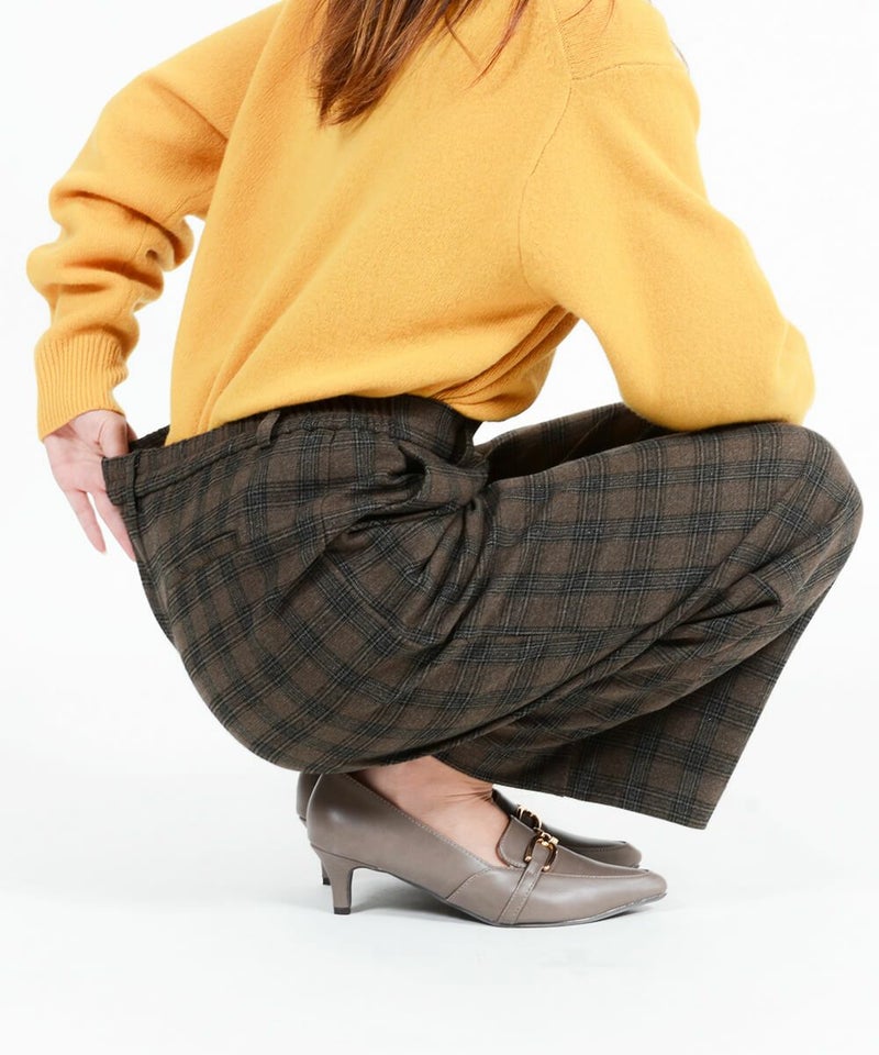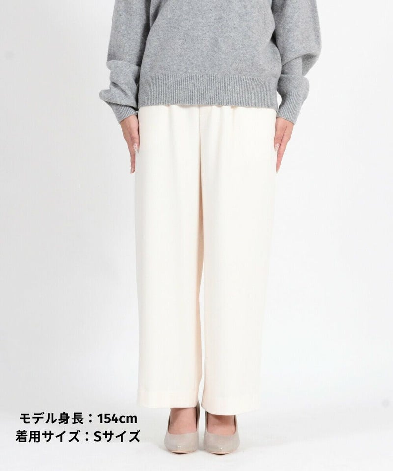 このワイドパンツは、ウール見えで上品な印象ながらも、お手入れ簡単素材なT/R両面起毛素材を使用。タテ・ヨコ、両方に伸びてくれるので締め付け感は感じません。